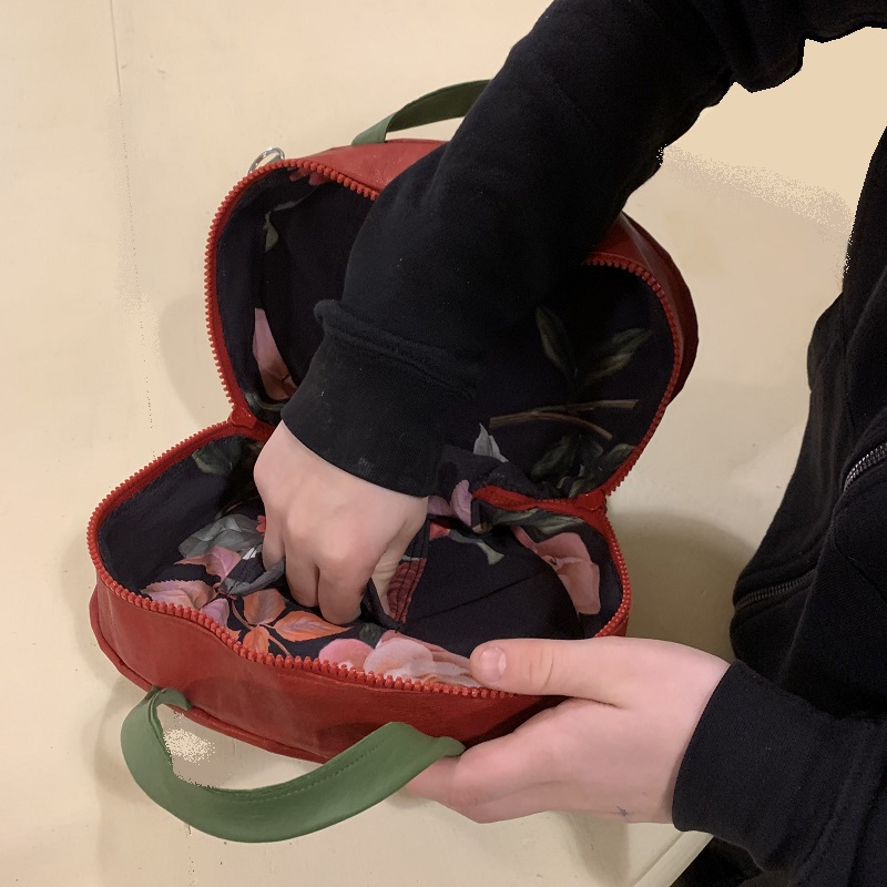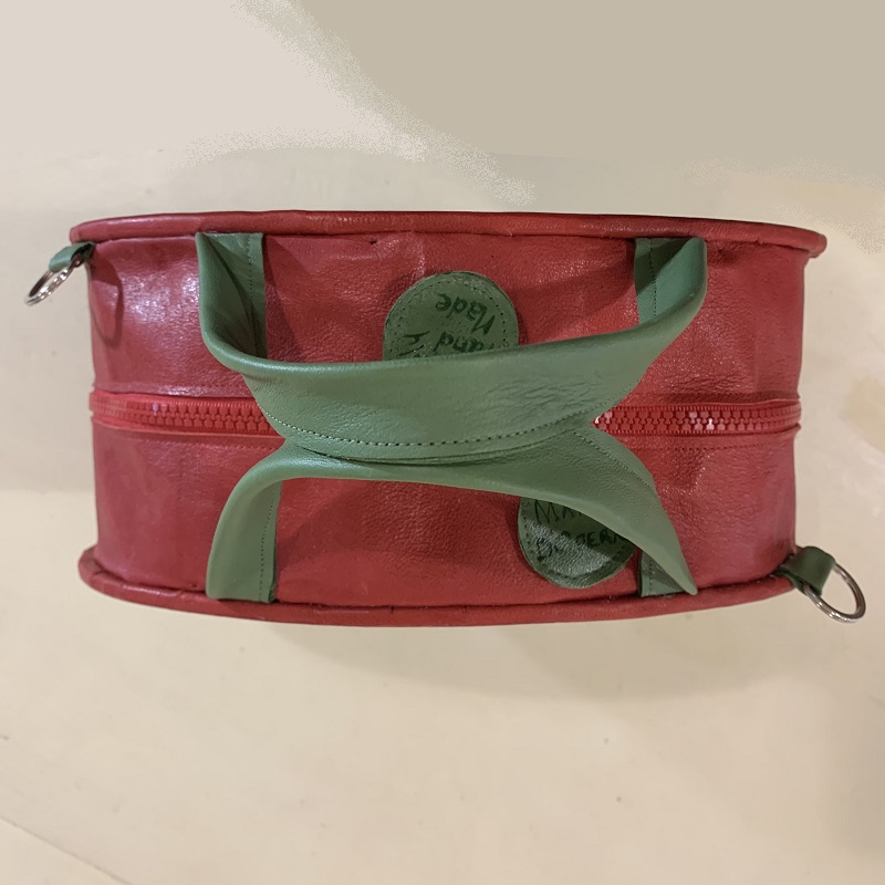 Handbag shaped like a bunch of poppies, entirely handmade with 2 colors inlay leather scraps, fabric, metal elements, wood structure, details hand painted. Removable shoulder belt cm. 100 with hooks that can be attached to rings on the bag. Closure with 2 zips, inside pocket, handles of 26 cm.