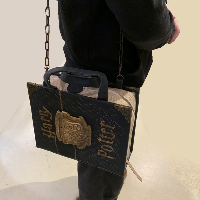 Bookbag Handbag shaped like a "Harry Potter 'book, entirely handmade with 2 colors leather scraps, fabric, metal elements, wood structure, handgilding stucco detail, handmade gilding. Removable shoulder belt cm.85, with hooks that can be attached to rings on the bag. Closure with 2 zips, inside pocket, handles of cm. 26.