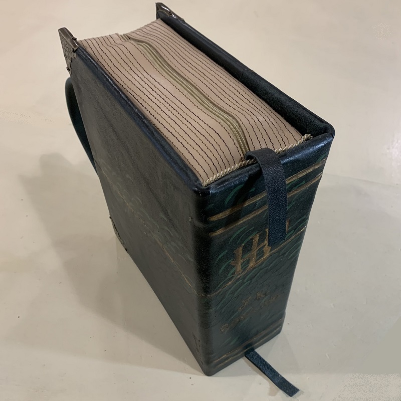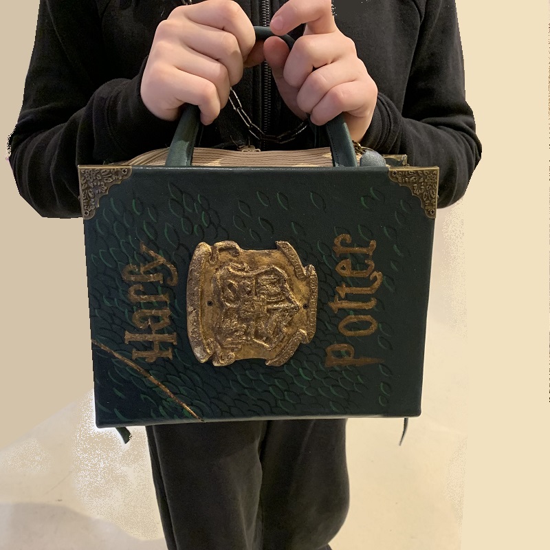 Handbag shaped like a "Harry Potter 'book, entirely handmade with 2 colors leather scraps, fabric, metal elements, wood structure, handgilding stucco detail, handmade gilding. Removable shoulder belt cm.85, with hooks that can be attached to rings on the bag. Closure with 2 zips, inside pocket, handles of cm. 26.