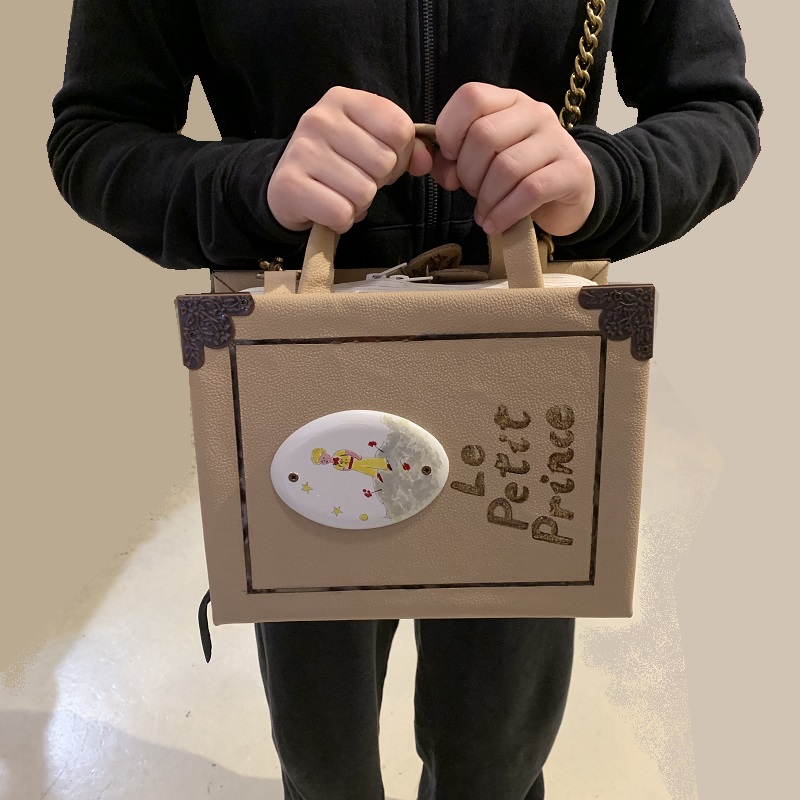 Hand bag shaped like a Little Prince book, entirely handmade with 2 colours leather scraps, fabric, metal elements, wood structure, gilding, detail in birch wood painted wth glazes.