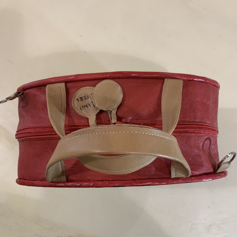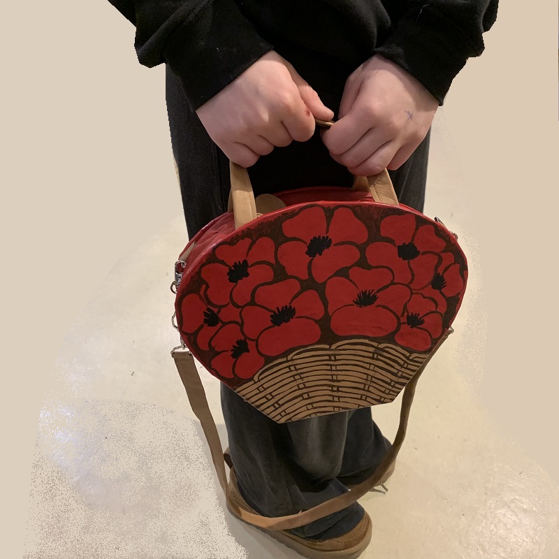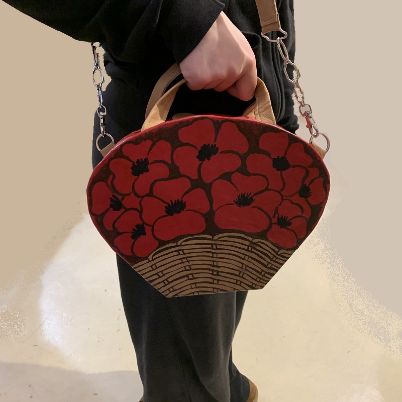 Borsa a mano sagomata a forma di cesto di papaveri, interamente fatta a mano con pelle di recupero 2 colori intarsiata, stoffa, elementi in metallo, struttura in compensato, dipinta a mano.