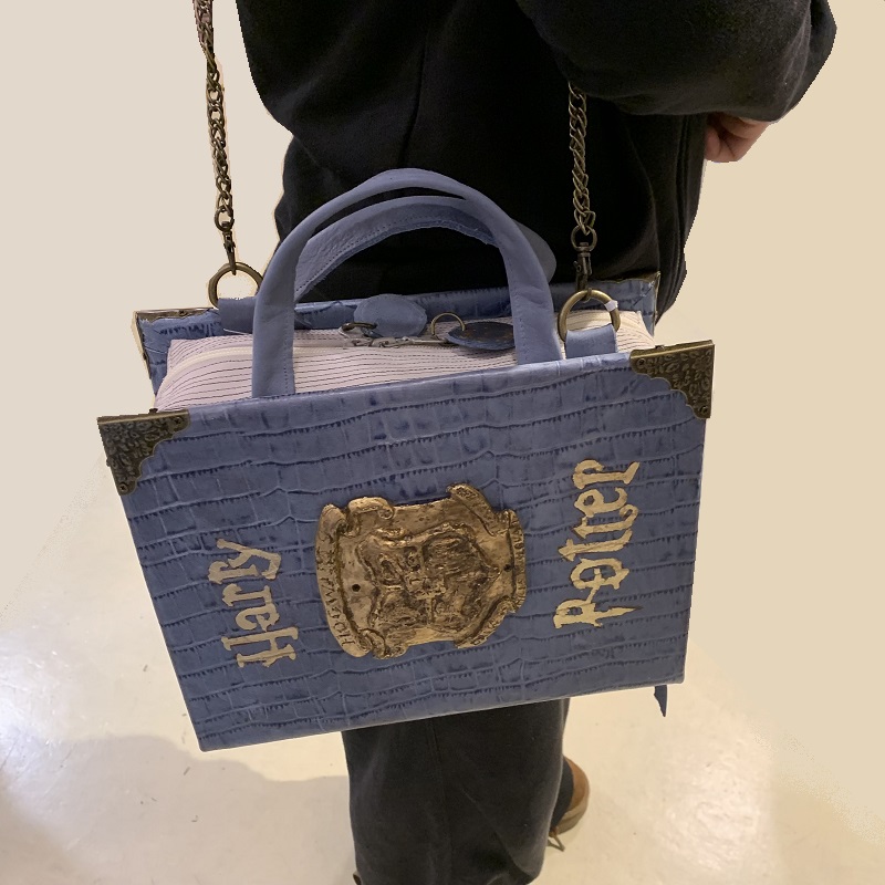 Borsa a mano sagomata a forma di libro, interamente fatta a mano con pelle di recupero in 2 colori, stoffa, elementi in metallo, struttura in compensato, particolari in stucco dorato a foglia e metallo bronzato, dipinta a mano.