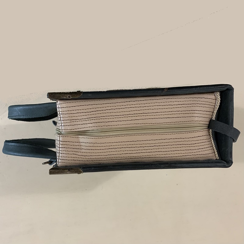 Borsa a mano sagomata a forma di libro, interamente fatta a mano con pelle di recupero in 2 colori, stoffa, elementi in metallo, struttura in compensato, particolari in stucco dorato a foglia e metallo bronzato, dipinta a mano.