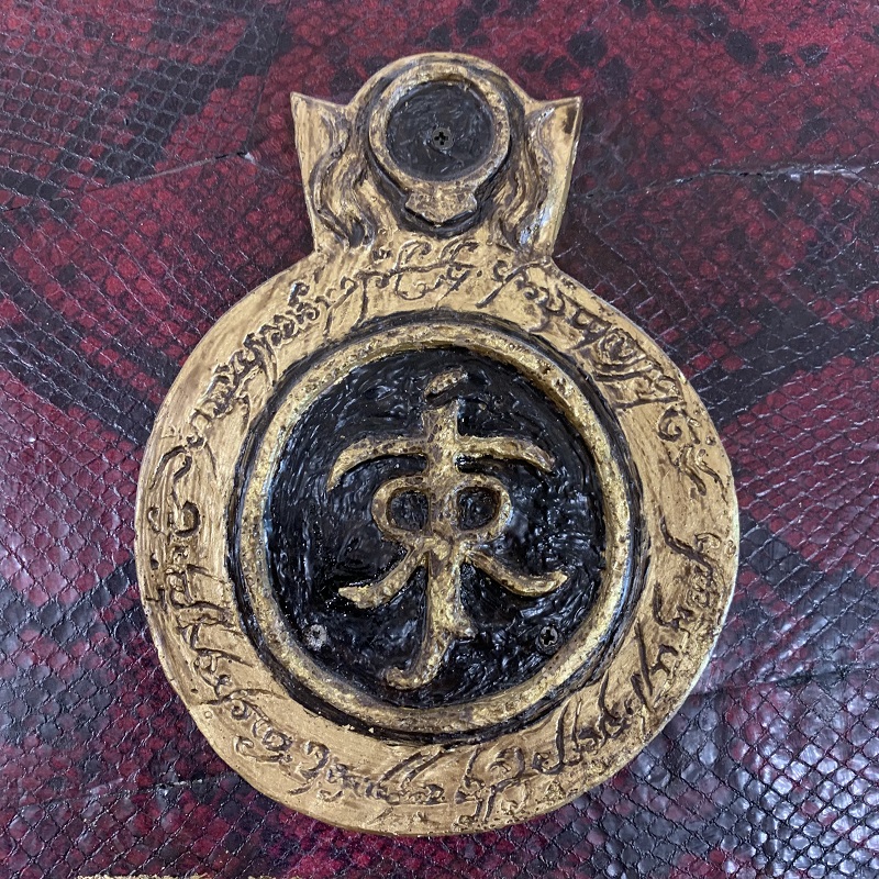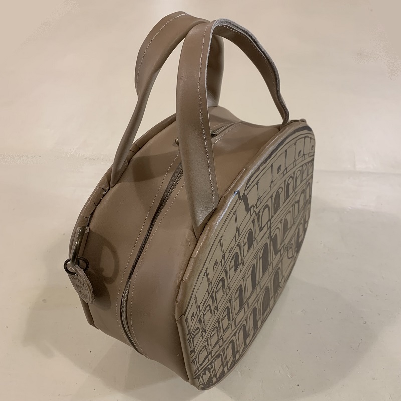 Borsa a mano a forma di libro, interamente fatta a mano con pelle di recupero 2 colori, stoffa, elementi in metallo, struttura in compensato, dorata a foglia a mano, particolare in stucco dorato a foglia e smaltato, dipinto a mano. Tracolla in metallo lunga circa cm. 85, removibile con moschettoni agganciabili ad anelli presenti sulla borsa, chiusura con 2 cerniere, tasca interna, manici di cm. 26 circa.