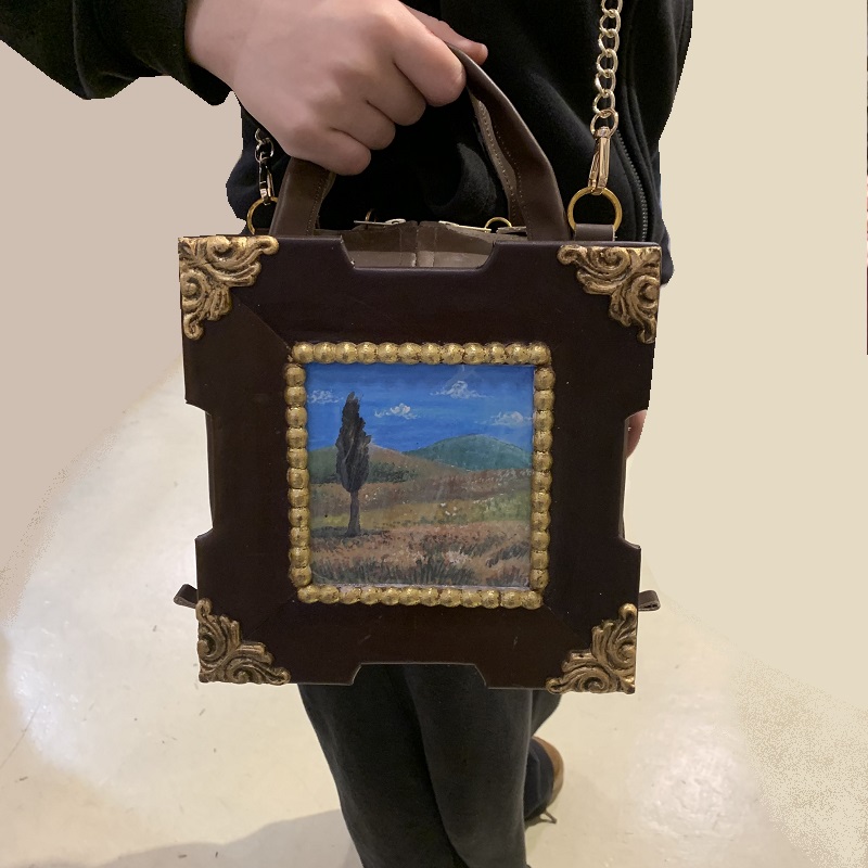 Borsa a mano sagomata a forma quadro, interamente fatta a mano con pelle di recupero intarsiata, stoffa, elementi in metallo, struttura in compensato, elementi in legno dorato, quadricromia da dipinto originale.