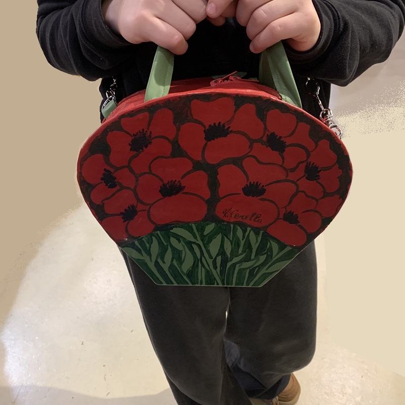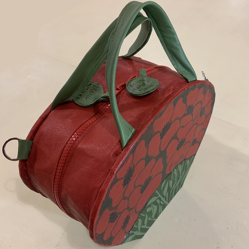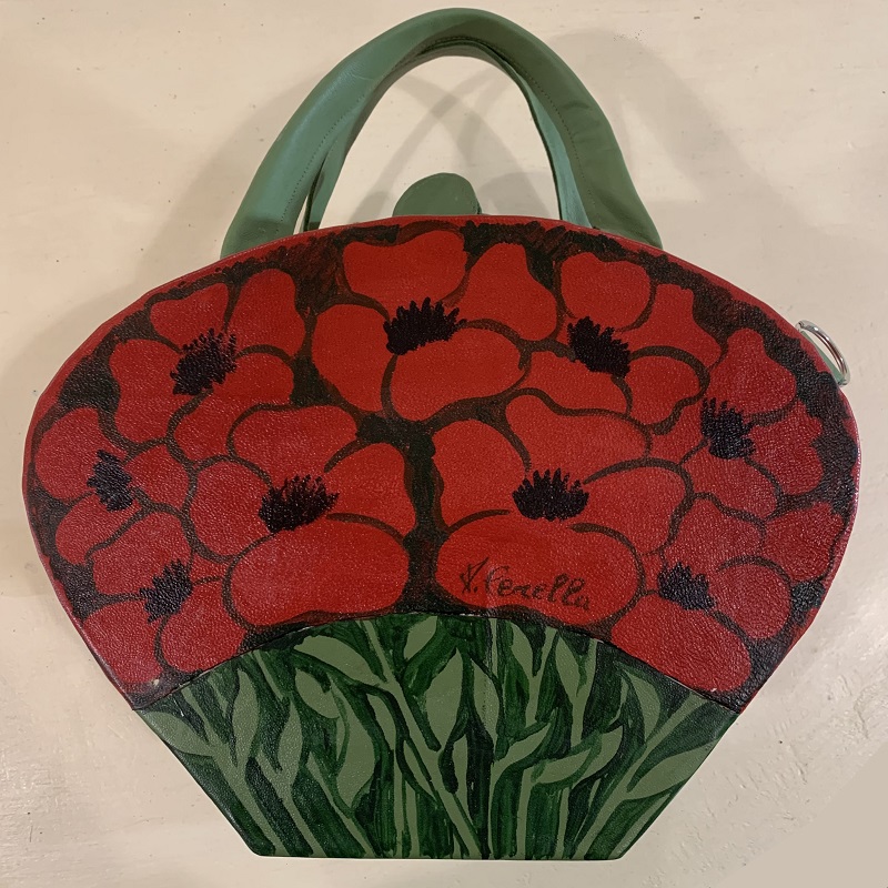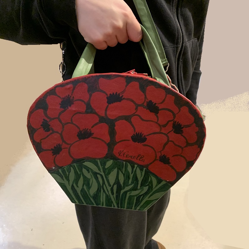 Handbag shaped like a bunch of poppies, entirely handmade with 2 colors inlay leather scraps, fabric, metal elements, wood structure, details hand painted. Removable shoulder belt cm. 100 with hooks that can be attached to rings on the bag. Closure with 2 zips, inside pocket, handles of 26 cm.
