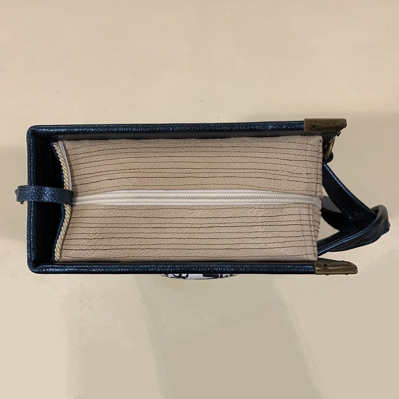 Handbag shaped like a "Alice in a wonderland" book, entirely handmade with 2 colors leather scraps, fabric, metal elements, wood structure, handpainted wood detail, handmade gilding. Removable shoulder beltcm.85, with hooks that can be attached to rings on the bag. Closure with 2 zips, inside pocket, handles of cm. 26.