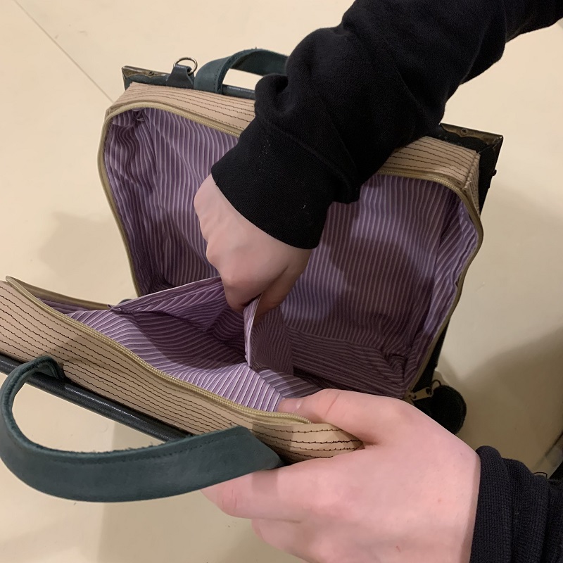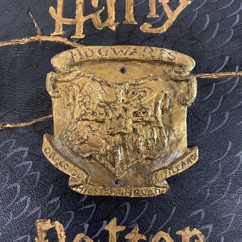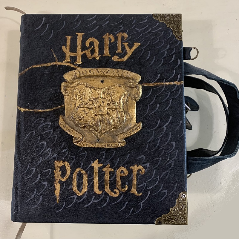 Bookbag Handbag shaped like a "Harry Potter 'book, entirely handmade with 2 colors leather scraps, fabric, metal elements, wood structure, handgilding stucco detail, handmade gilding. Removable shoulder belt cm.85, with hooks that can be attached to rings on the bag. Closure with 2 zips, inside pocket, handles of cm. 26.