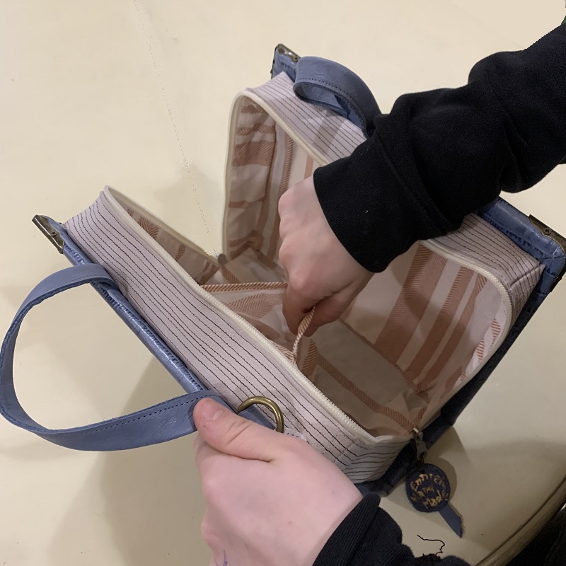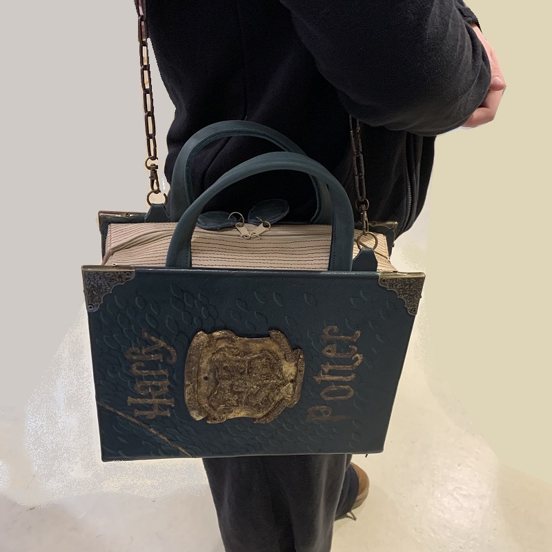 Handbag shaped like a "Harry Potter 'book, entirely handmade with 2 colors leather scraps, fabric, metal elements, wood structure, handgilding stucco detail, handmade gilding. Removable shoulder belt cm.85, with hooks that can be attached to rings on the bag. Closure with 2 zips, inside pocket, handles of cm. 26.