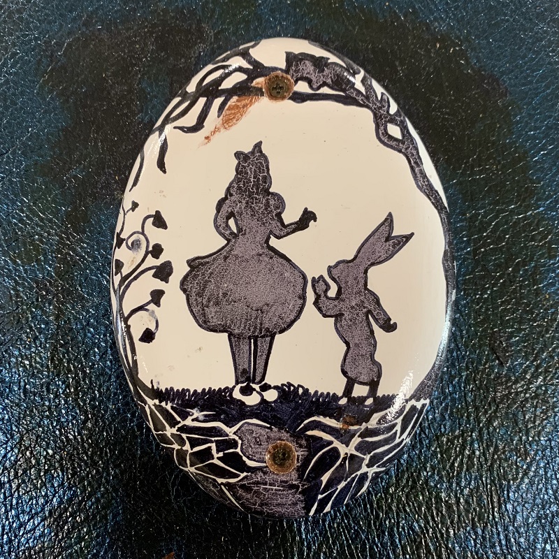Hand bag shaped like a Little Prince book, entirely handmade with 2 colours leather scraps, fabric, metal elements, wood structure, gilding, detail in birch wood painted wth glazes.