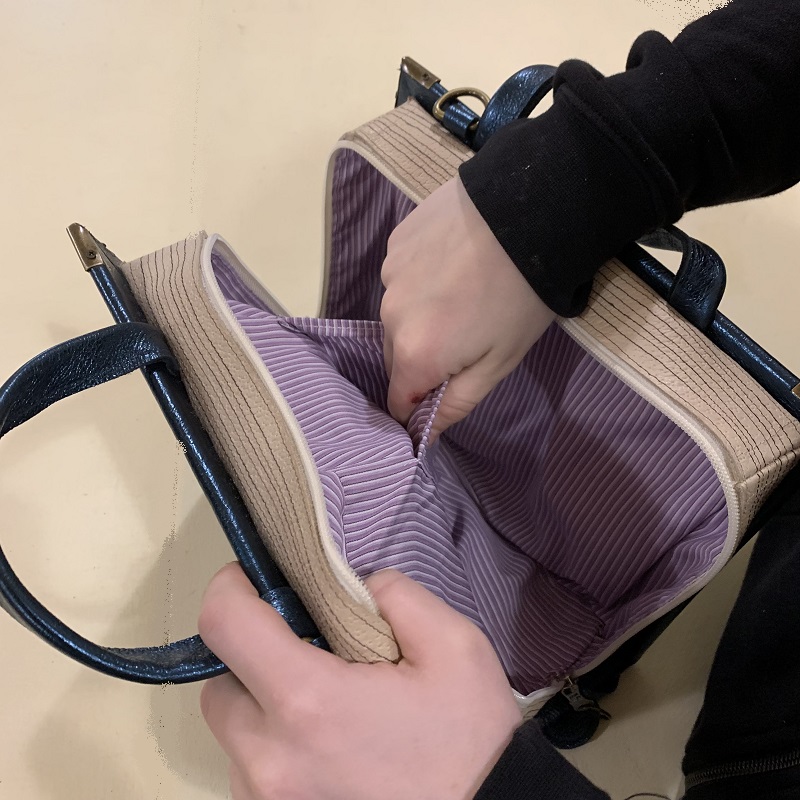 Borsa a mano sagomata a forma di libro, interamente fatta a mano con pelle di recupero in 2 colori, stoffa, elementi in metallo, struttura in compensato, particolari in multistrato di betulla dipinto a mano con smalti e metallo bronzato, dipinta a mano.