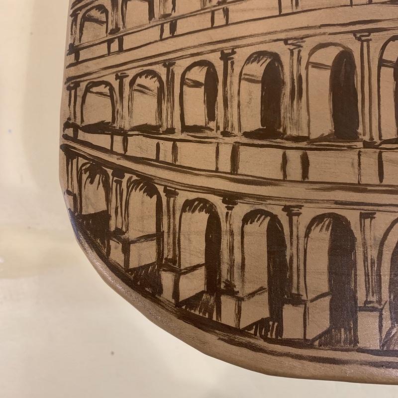 Borsa sagomata a forma di anfiteatro romano, interamente fatta a mano con pelle di recupero, stoffa, elementi in metallo, struttura in compensato, dipinta a mano. Tracolla lunga cm. 100 circa removibile con moschettoni agganciabili ad anelli presenti sulla borsa, chiusura con 2 cerniere, tasca interna, manici di cm. 26 circa.