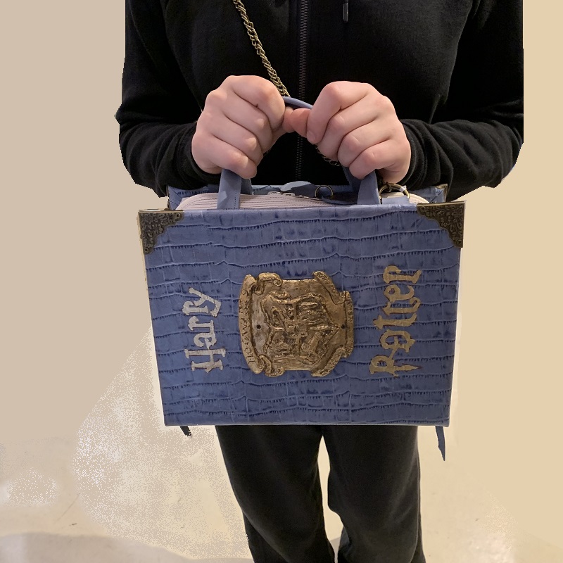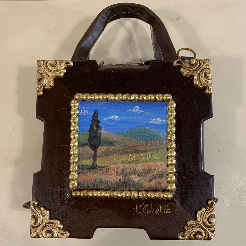 Borsa a mano sagomata a forma di libro, interamente fatta a mano con pelle di recupero in 2 colori, stoffa, elementi in metallo, struttura in compensato, particolari in stucco dorato a foglia e metallo bronzato, dipinta a mano.
